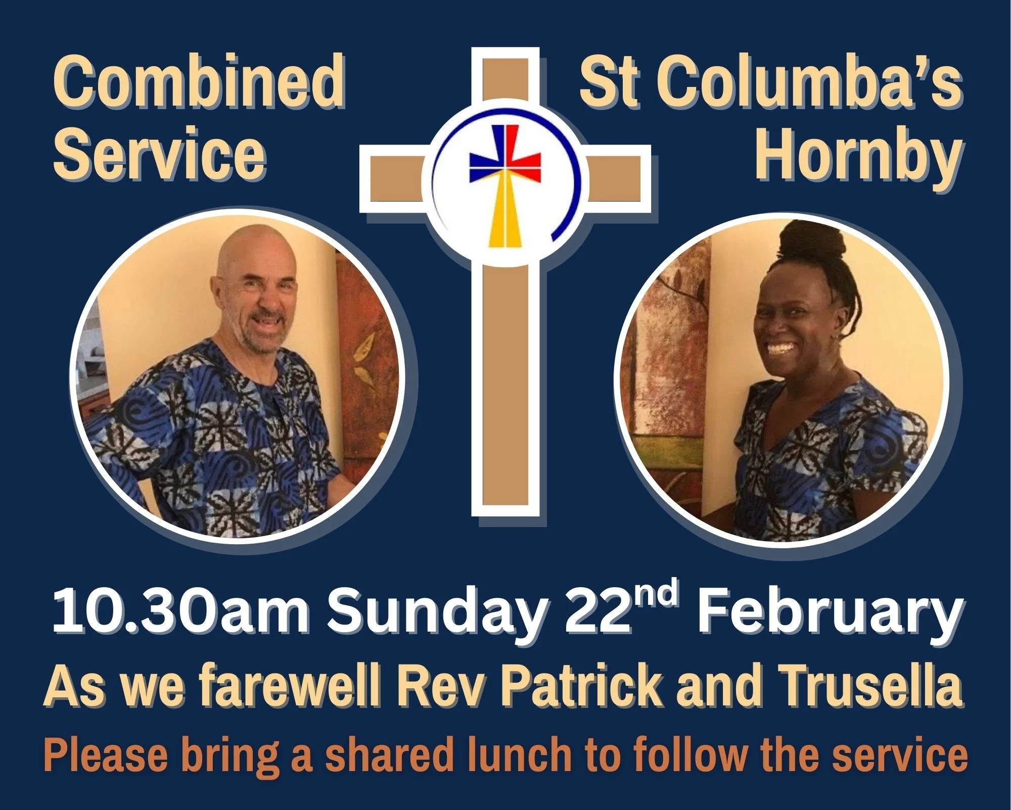 10.30am: Combined Service at St Columba's to farewell Patrick and T this is followed by a bring and share lunch.