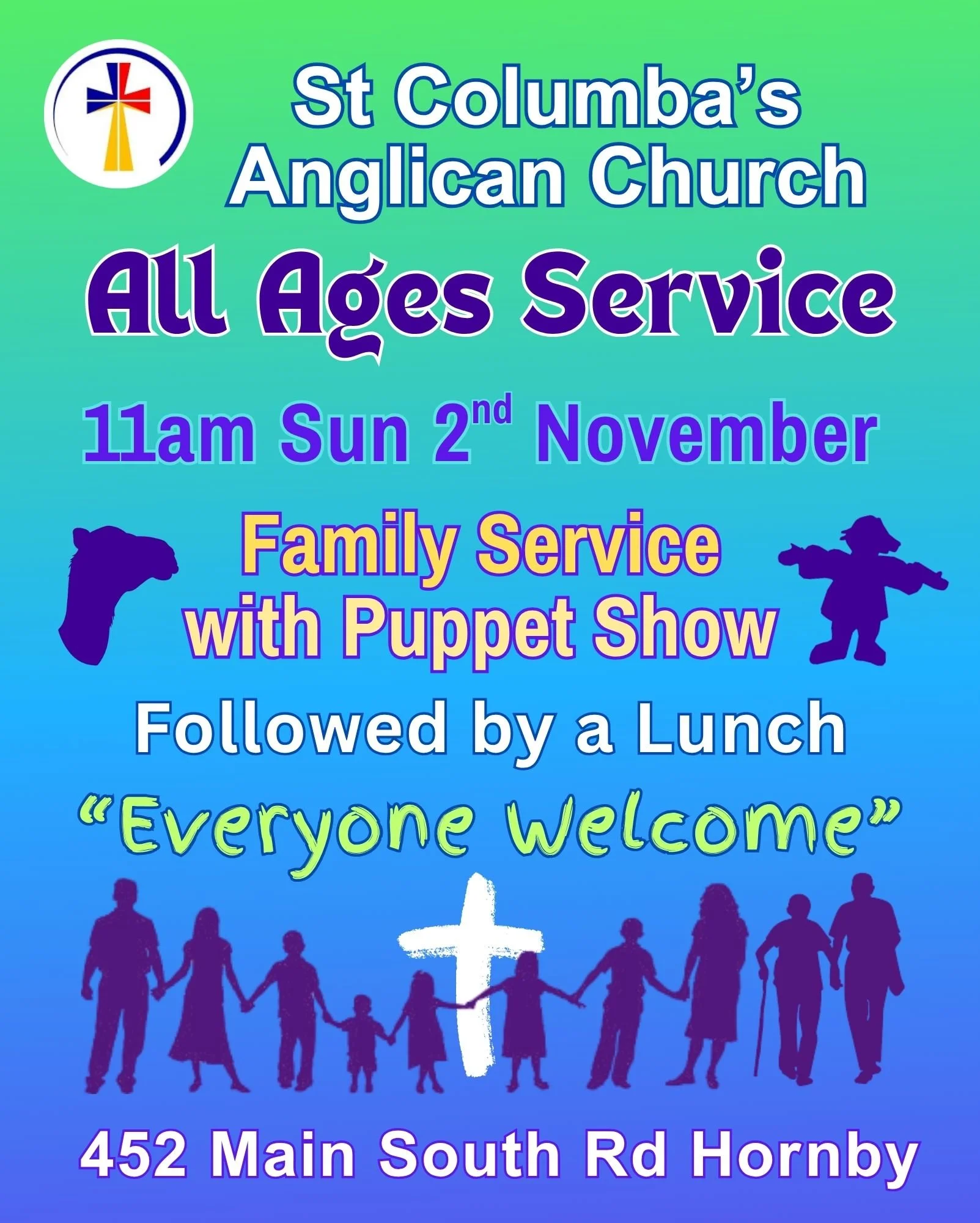 All Age Service Sunday 2 November. All are welcome. St Columba’s Church. 452 Main South Road