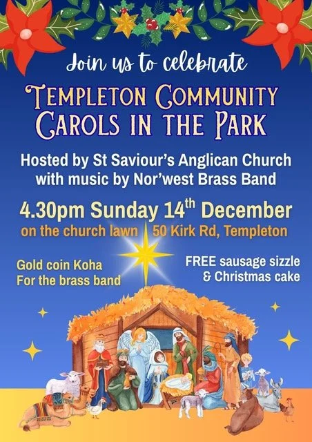 Carols in the Park - Templeton Community Carols on the lawn at 50 Kirk Rd, Templeton - St Saviour’s Church Starting at 4.30pm on Sunday 14 December 2025 .